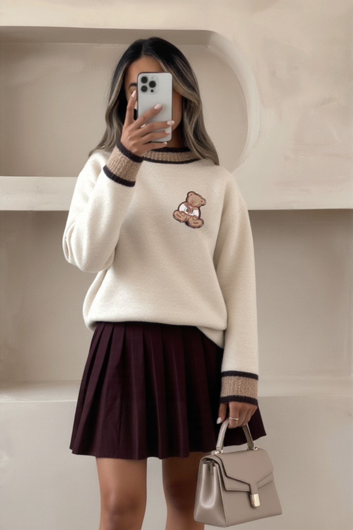 Een look die warmte, speelsheid en elegantie samenbrengt. De Teddy Dreams Sweater is gemaakt van een heerlijk zachte stof in een warme beige tint, afgewerkt met subtiele bruine details en een schattig geborduurd teddybeertje voor die playful chic touch. Perfect voor dagen waarop je comfort wil combineren met stijl.