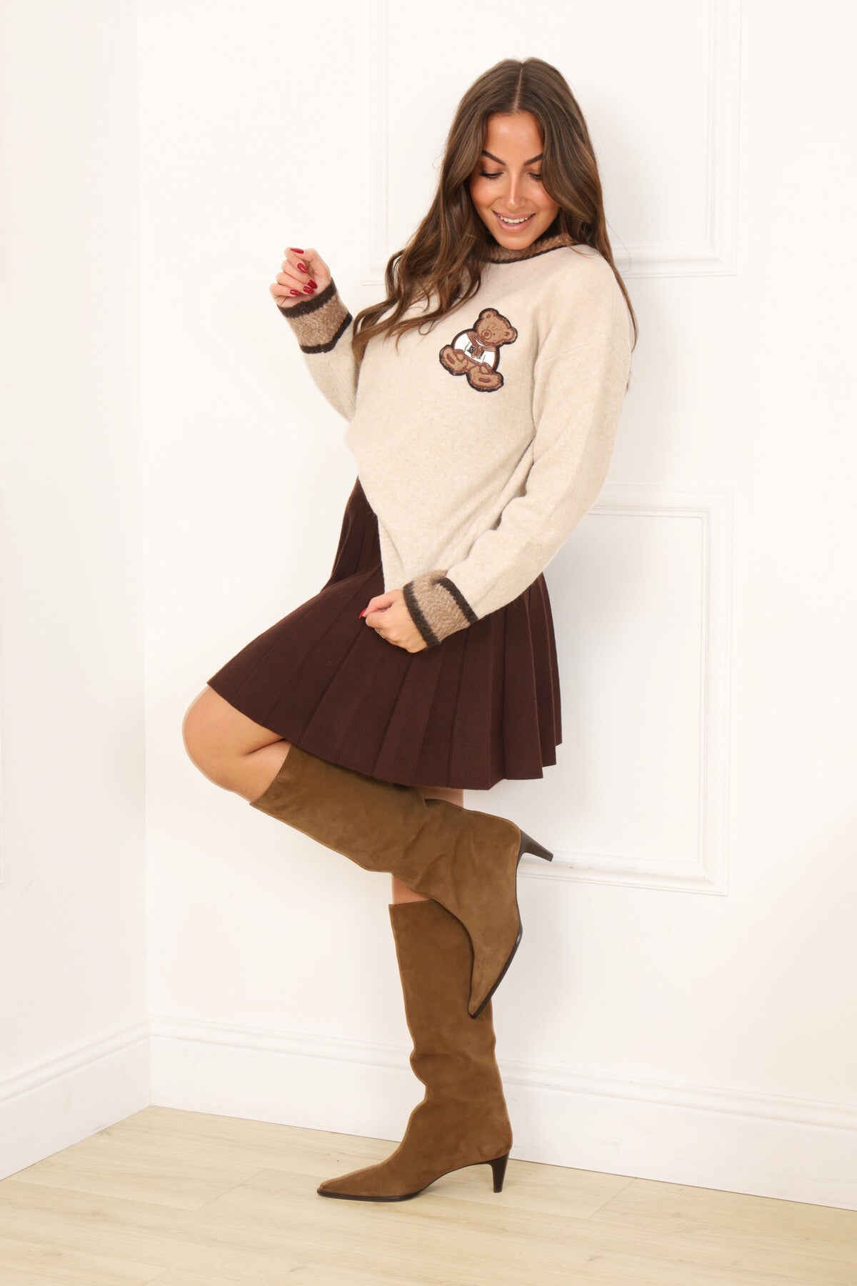 Een look die warmte, speelsheid en elegantie samenbrengt. De Teddy Dreams Sweater is gemaakt van een heerlijk zachte stof in een warme beige tint, afgewerkt met subtiele bruine details en een schattig geborduurd teddybeertje voor die playful chic touch. Perfect voor dagen waarop je comfort wil combineren met stijl.